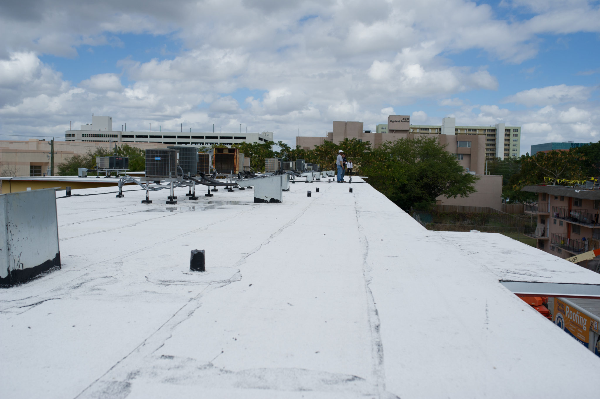 Florida Quality Roofing was contracted to re-roof two Miami Commercial Reflective Cool Roof buildings near the downtown Miami area in early 2013. We installed an energy star commercial reflective cool roof system which helped the owners receive FPL rebates and save on future energy costs by as much as 30%. This Miami Commercial Reflective Cool Roof CertainTeed CoolStar roofing system exceeds Energy Star standards by reflecting 70% of the radiation away from the surface. This cool roofing technology keeps this roof up to 50-60 degrees cooler than a conventional roof.
